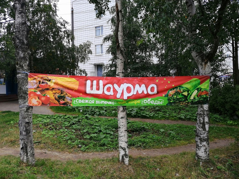 Страдают даже и без того не самые эстетичные мусорные площадки из профнастила. Одна организация, связанная с ОСАГО, прошлась по дворам и завесила площадки своими баннерами. Про деревья вообще молчу. Например, прямо на углу у правительственного здания на Выучейского, 18, повесили рекламу шаурмы.