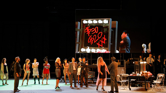 © Festival d'Aix-en-Provence Сцена из оперы «Расцвет и падение города Махагони» Наконец, фестиваль заявил принципиально иной баланс между современной музыкой и оперным репертуарным стандартом. Он 50 на 50 — и это при условии, что в «стандарт» мы зачислим «Махагони». Хотя постановки партитуры Вайля — при всех ее музыкальной изощренности и театральной соблазнительности — появляются в репертуаре больших оперных институций лишь изредка: театры не обладают ни вокальными, ни концептуальными, ни эстетическими ресурсами для этого. Спектакль в Эксе вполне продемонстрировал сложность задачи: режиссерское решение ван Хове (Махагони как постановочный рай на подвижных сценических конструкциях в мире fake news) сбоило и к тому же вредило звуку, который проваливался в пространстве пустой сцены.