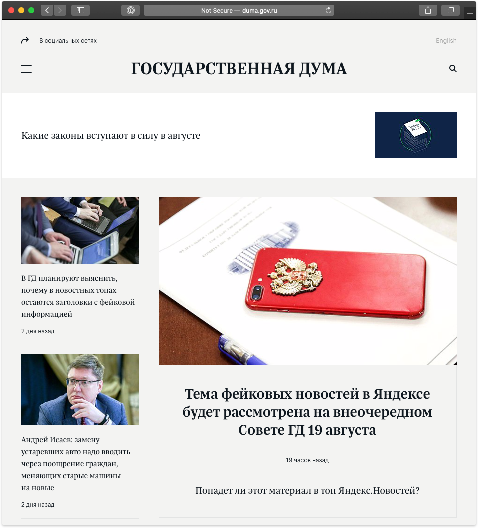 15 августа руководство Госдумы заявило, что намерено всерьез обсудить принятие законопроекта об ограничении права иностранцев владеть крупными российскими сайтами. Это произошло после того, как в топ «Яндекс.Новостей» вышла история о возможном запрете старых автомобилей, которую депутаты через несколько часов опровергли. Теперь «Яндекс», головная компания которого зарегистрирована в Нидерландах, хотят перевести под российский контроль из-за «фейковых» заголовков в топе новостей. Власти уже три года постепенно усиливают контроль над тем, что показывает россиянам самый популярный источник новостей в рунете.