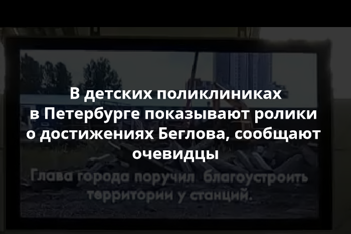 В детских поликлиниках Петербурга перед выборами губернатора показывают ролики о достижениях врио Александра Беглова. Об этом сообщает телеграм-канал о городской политике «Ротонда» со ссылкой на очевидцев.