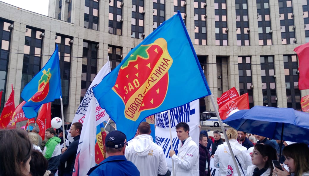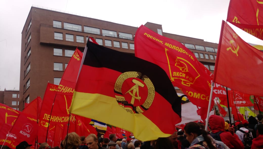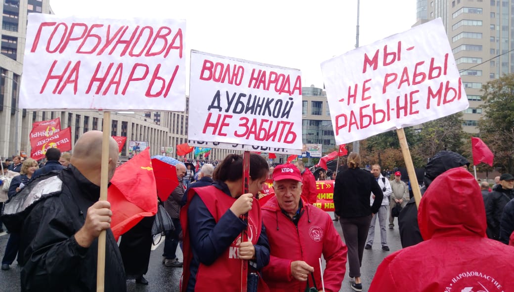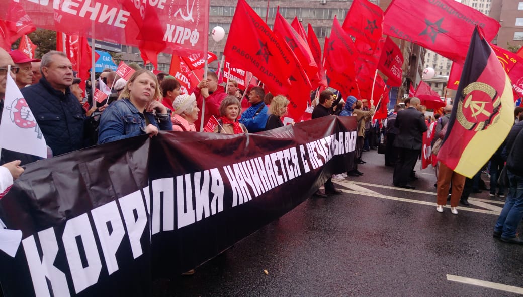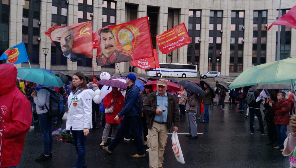 На митинг на проспект Сахарова, судя по флагам, пришли не только представители КПРФ, но также члены Объединенной коммунистической партии, «Левого фронта», Революционной рабочей партии, а также Союза коммунистической молодежи. Отдельно выделялась целая колонна от подмосковного Совхоза имени Ленина, который возглавляет Павел Грудинин, кандидат от КПРФ на президентских выборах 2018 года.