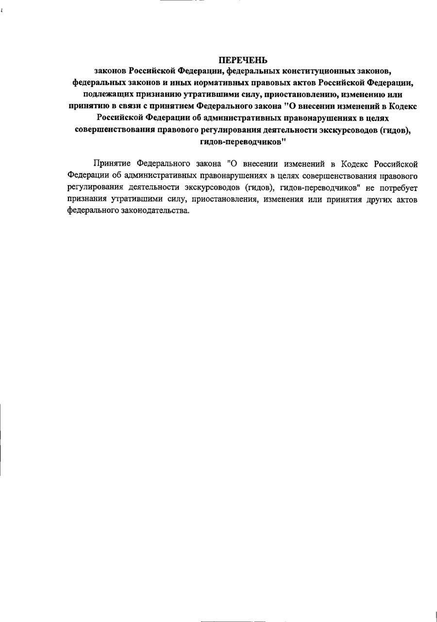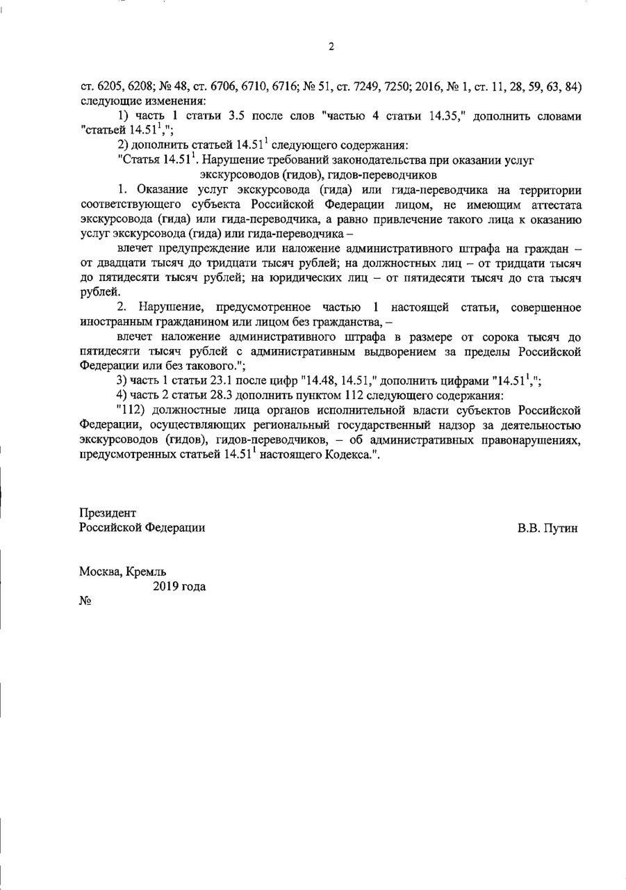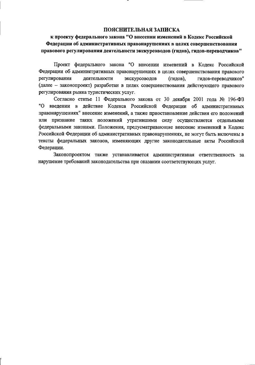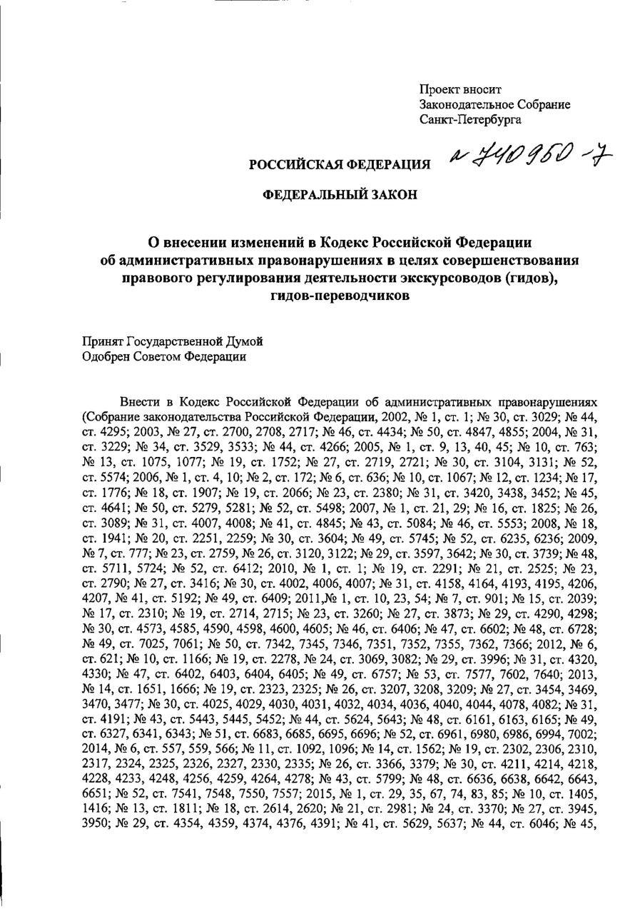 Законопроектом предлагается введение штрафа за оказание услуг гида или экскурсовода без соответствующего аттестата. Физических лиц могут предупредить или оштрафовать на сумму от 20 до 30 тыс. рублей, должностных лиц, действующих в интересах компаний, – от 30 до 50 тыс. рублей, а юридических лиц – от 50 до 100 тыс. За те же деяния, совершенные иностранцем или лицом без гражданства, штраф составит от 40 до 50 тыс.