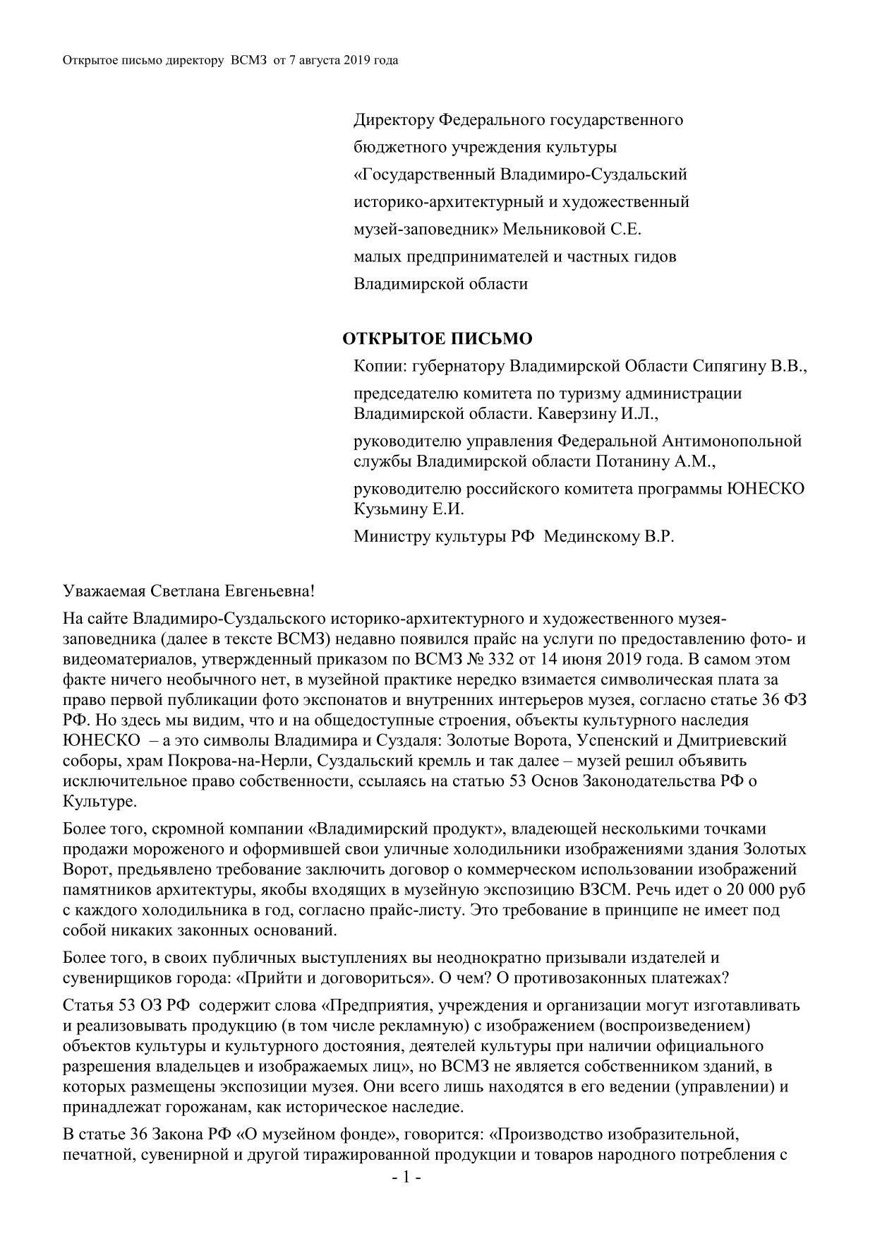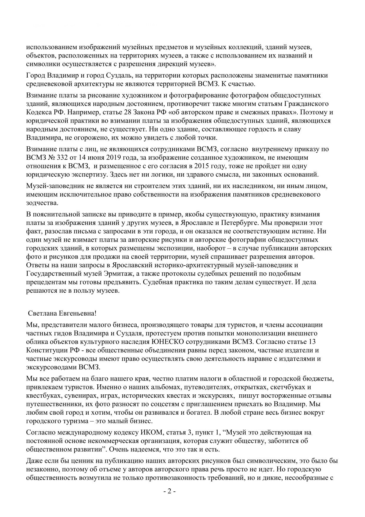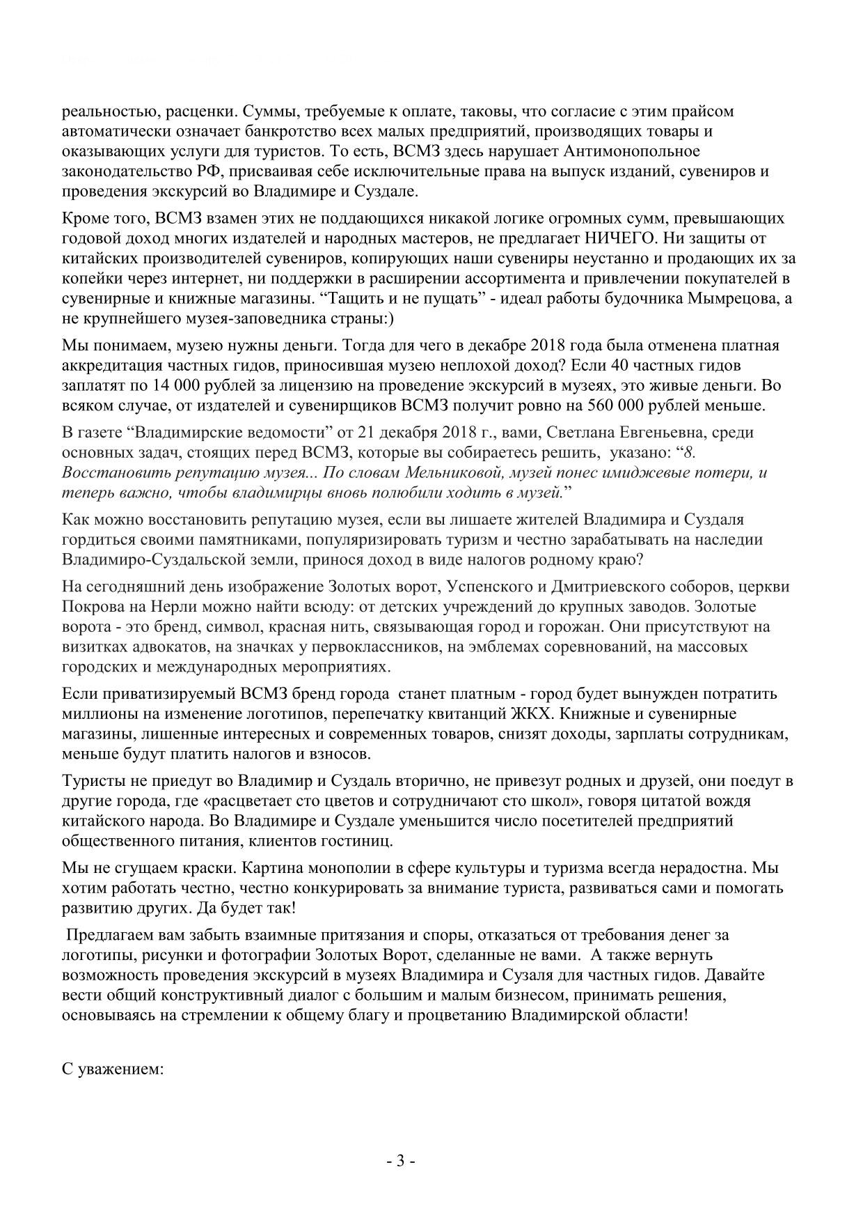 “Как можно восстановить репутацию музея, если вы лишаете жителей Владимира и Суздаля гордиться своими памятниками, популяризовывать туризм и честно зарабатывать на наследии Владимиро-Суздальской земли, принося доход в виде налогов родному краю?”