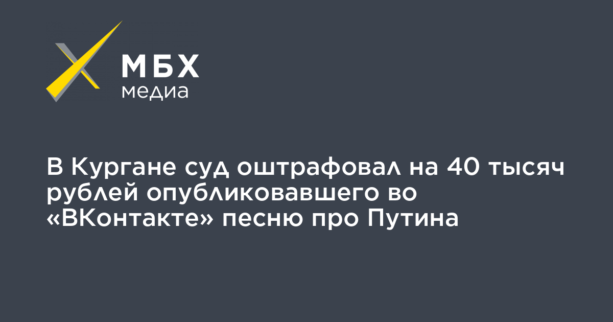 Курганский городской суд постановил оштрафовать на 40 тысяч рублей участника движения «Агит-Россия» Евгения Жукова, который опубликовал во «ВКонтакте» песню про Владимира Путина, об этом «МБХ медиа» сообщил адвокат международной группы «Агора» Станислав Селезнев.