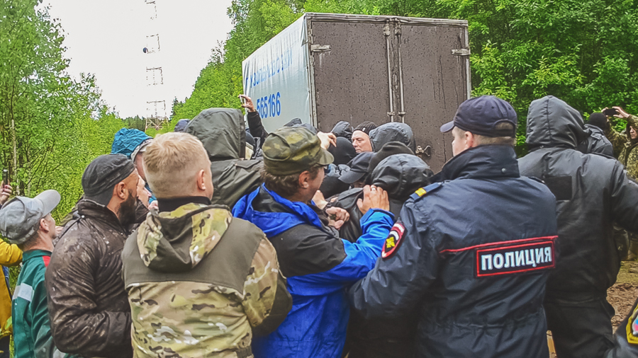 — У них перекачка! — отвечает активистка из Урдомы Анна Шекалова и пытается сдернуть балаклаву с одного из сотрудников ЧОП, который отворачивается и закрывает собой зазор между кузовами автомобилей