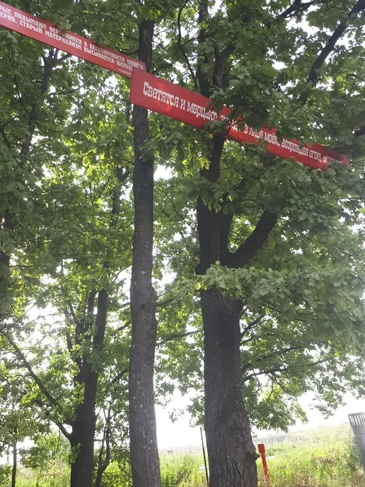 После праздника Ирина Заика поехала жаловаться на вандализм жителей в администрацию Одинцовского района, а к арт-центру, по ее словам, тем временем пришел Жаудат Ханафиев и выбросил в мусорку большой супрематический баннер и детские рисунки, висевшие на заборе, а елки растоптал ногами.