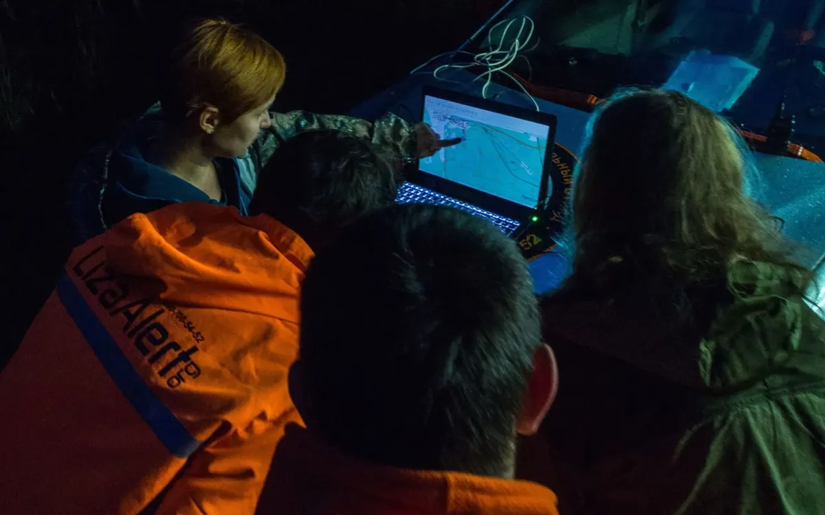 Выглядит все серьезнее, чем в первый раз. Две основные машины координаторов составляют штаб — на одной переносная антенна. В ноутбуки загружают карту местности, треки маршрута, по которому местные отряды искали пострадавшего. Пока карту разбивают на квадраты, все спешно переодеваются: термобелье, непромокаемые штаны и куртки, шапки, резиновые сапоги, перчатки. Это конец июля. В памятке волонтера написано взять все это с собой. Когда я скептически укладывала сумку для выезда на поиск, светило солнце, прогноз сообщал про двадцать один градус тепла. К ночи холодает, я не пожалею о горнолыжных штанах и носках с начесом уже через полчаса.