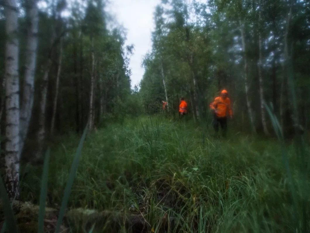 Почти два часа ночи. Лес тяжелый — буреломы, ручей, несколько оврагов. Пока координатор Ольга раздает задачи, быстро подкрепляемся привезенными кем-то булочками, растворимым кофе, делимся шоколадкой, шутим. Мы с Белорусом и Енотом сохраняем ту же тройку. Теперь мы «Лиса-5».