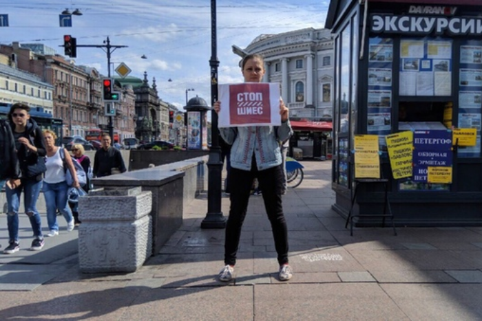 В центре Петербурга прошла серия одиночных пикетов. Горожане выступили против строительства мусорного полигона на станции Шиес в Архангельской области — туда планируют привозить отходы из Москвы.