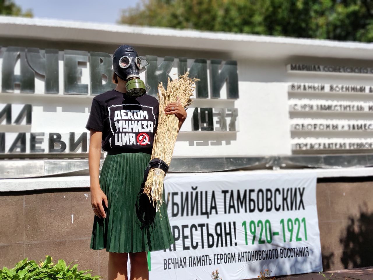 0:00 0:00:13Участники акции повесили на постамент памятника плакат "Убийца тамбовских крестьян! 1920–21. Вечная память героям антоновского восстания" и устроили перформанс с противогазами и снопом пшеницы. По словам организаторов, цель акции – чтобы "москвичи знали, что рядом с их домами увековечена память хладнокровного и беспощадного убийцы".