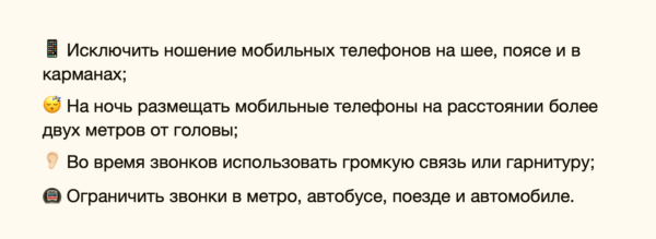 Правительство также рекомендовало: исключить ношение мобильных телефонов на шее и в карманах; поддерживать максимальное удаление мобильных телефонов от головы в момент разговора, для этого предложили использовать громкую связь или гарнитуру; размещать телефоны на ночь на расстоянии более двух метров от головы.