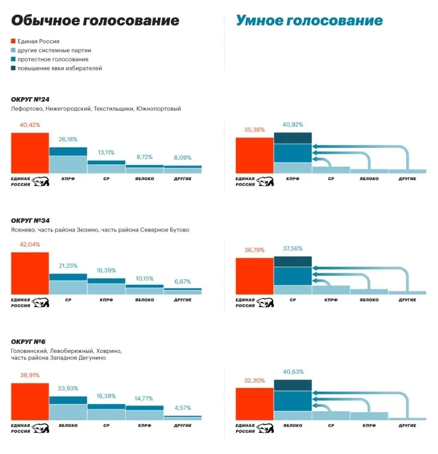 Посмотрите на округ 37 в МГД, где не допустили до выборов Елену Русакову из «Яблока». Кто там остался для «умного голосования»? Три кандидата. Коммунист Губенко, до сих пор благодарный Сталину за «наведение порядка», «эсер» Романович, который по уверениям собственных коллег, слил список «СР» в угоду мэрии, и жириновец Максимов. Выбирай. «Ломай игру «Единой России» (которая своего кандидата вообще не выставила, освободив округ для Губенко)…