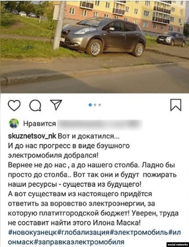 "Вот и докатился… и до нас прогресс в виде бэушного электромобиля добрался! Вернее не до нас, а до нашего столба. Ладно бы просто до столба. Вот так они и будут пожирать наши ресурсы – существа из будущего! А вот существам из настоящего придётся ответить за воровство электроэнергии, за которую платит городской бюджет! Уверен, труда не составит найти этого Илона Маска!" – написал Кузнецов и выложил фотографии. Однако позднее пост был удален без объяснения причин.