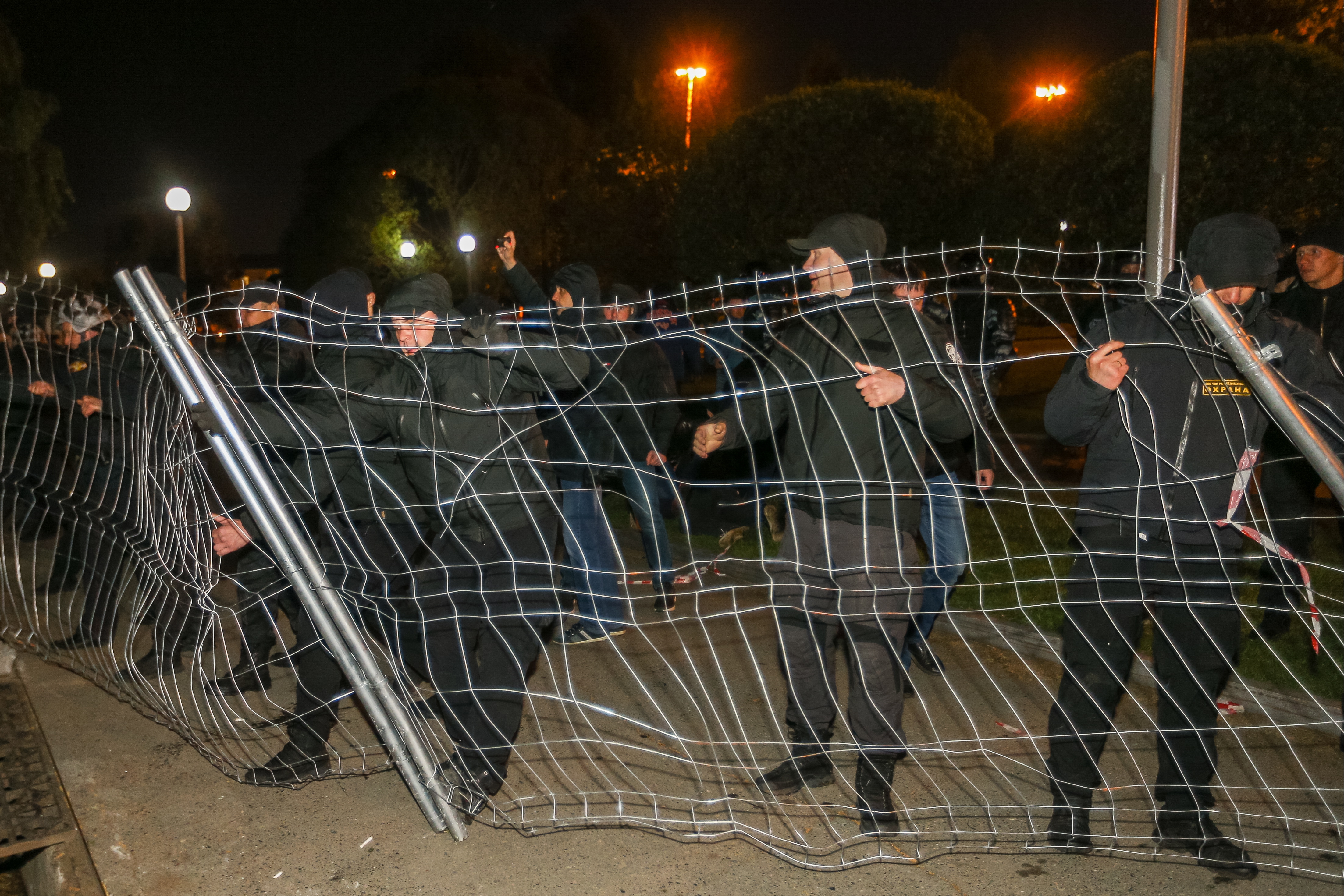 Очевидцы подтверждают, что в первый вечер противостояния полиция не принимала значительного участия в событиях. Роль защитников строительства взяли на себя представители ЧОП и спортсмены из Академии единоборств, которые в какой-то момент начали вытеснять горожан с территории сквера. Полиция при этом отступила к проезжей части и бездействовала, что и возмутило Панкратова.
