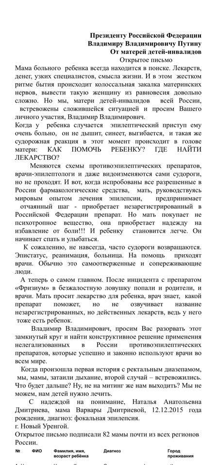 Автором письма 82 родителей стала жительница Нового Уренгоя Наталья Дмитриева. У её трёхлетней дочери Варвары – фокальная эпилепсия, а весь диагноз "занимает две страницы". Сразу после рождения девочку самолётом МЧС увезли в Санкт-Петербург, где она с мамой живет до сих пор.