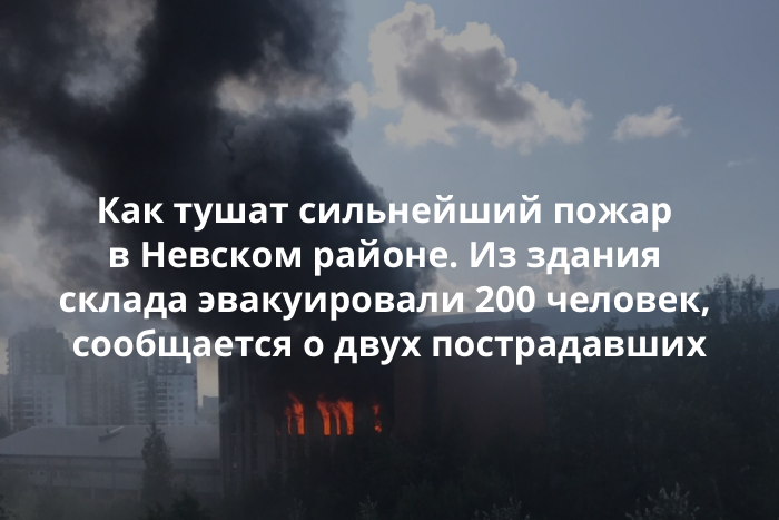 На Складской улице в Невском районе вечером 22 августа загорелся склад. Из здания эвакуировали 200 человек. Пожар тушили до утра, ему присвоили самый высокий уровень сложности. Два человека пострадали.