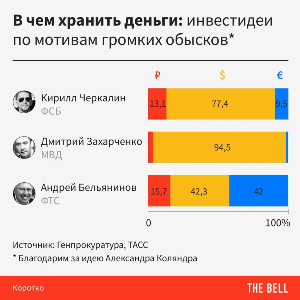 - Оказалось, что Захарченко сделал ставку исключительно на американскую валюту — в ней он хранил почти все найденные у него при обысках деньги. Черкалин также отдавал предпочтение долларам (на них пришлось 77,4% обнаруженных у него наличных), еще 13,1% он держал в рублях, а 9,5% — в евро. «Стратегия» Бельянинова оказалась самой сбалансированной и патриотичной: почти одинаковый объем денег он хранил в евро и долларах (примерно по 42%), а остальное в рублях.