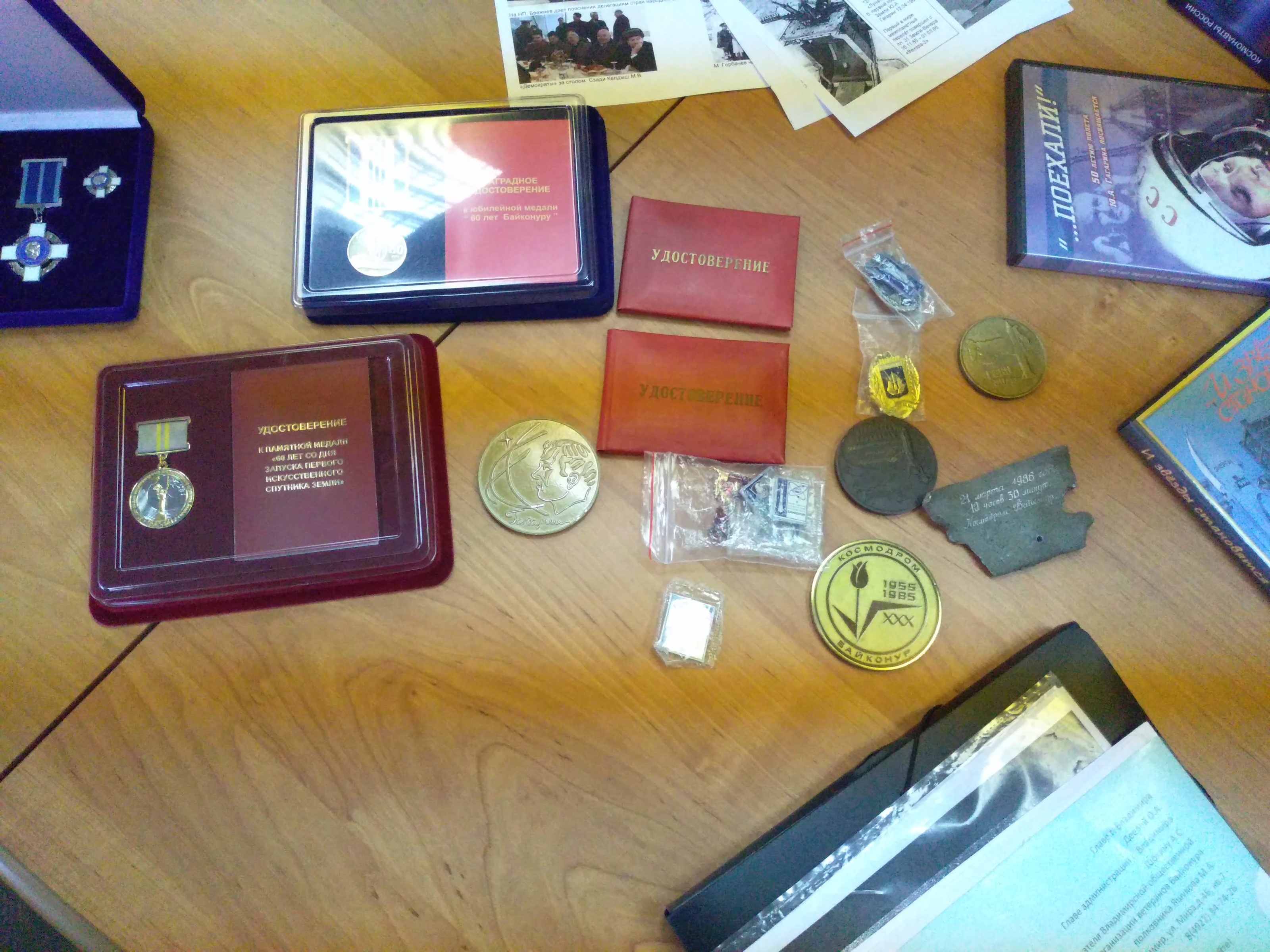 Михаил Адамович продемонстрировал юбилейные награды, которые были выпущены в СССР, и кусочек ракеты с памятной надписью.