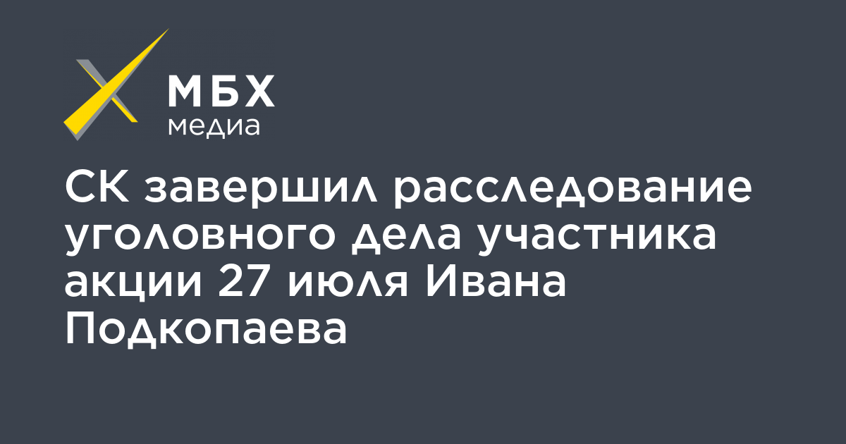 СК завершил расследование уголовного дела в отношении Ивана Подкопаева, которого обвиняют в насилии в отношении полицейского на акции 27 июля в Москве. Сообщение опубликовано на сайте ведомства.
