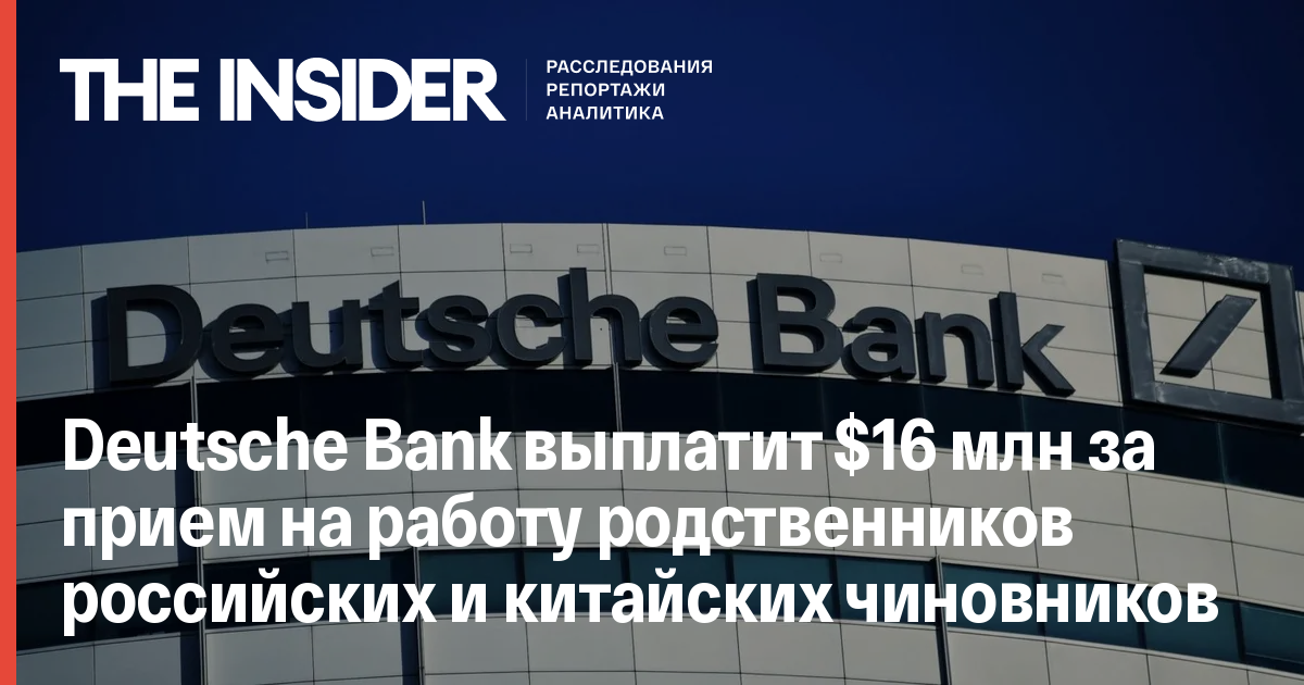 Deutsche Bank выплатит $16 млн за нарушение американского закона о коррупции за рубежом, сообщает Reuters. Штраф назначила американская Комиссия по ценным бумагам за то, что банк принимал на работу родственников российских и китайских чиновников.