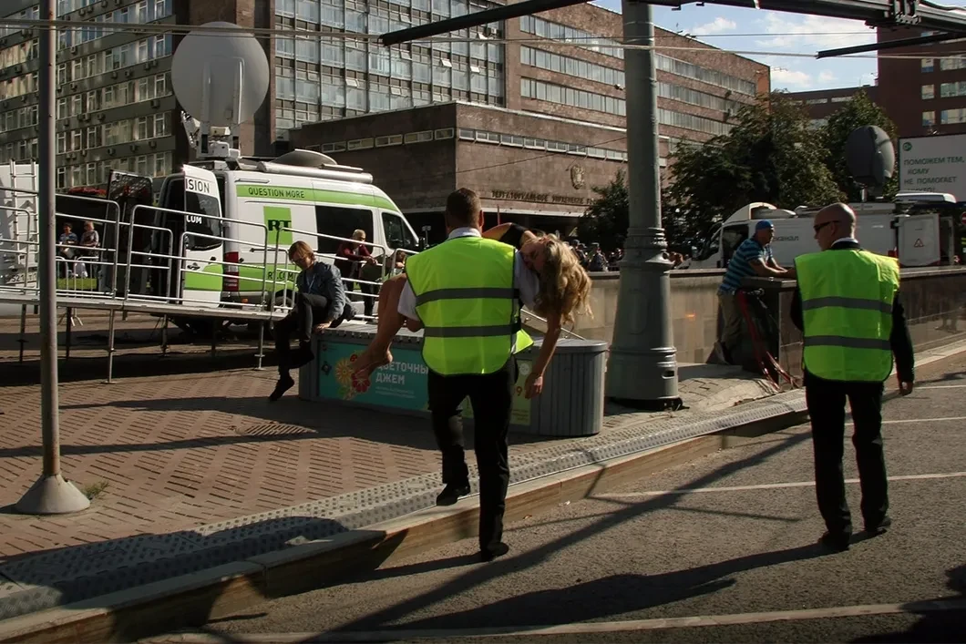 Об акциях оппозиции в столице для пришедших сегодня напоминают только активисты НОД у рамок. У одной из женщин на шее висят плакаты «Майдану нет» и «Работайте, братья» — под «братьями» имеются в виду омоновцы на фото. Нодовцы выступают на камеру с речью о том, что оппозиционеры «берут все дурное с Запада, все то, что чуждо российскому обществу».