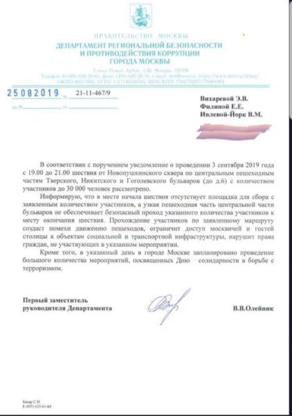 Ранее Власти отказали Либертарианской партии в согласовании шествия по бульварам 31 августа в центре Москвы, также отказы на свои заявки получили руководитель психологической службы «Руси Сидящей» Иван Брушлинский, глава штаба Геннадия Гудкова Эльвира Вихарева и муниципальный депутат Елена Русакова.