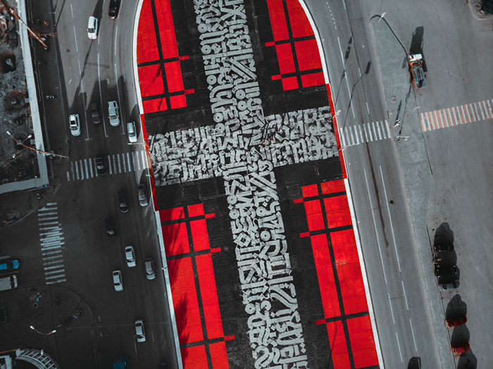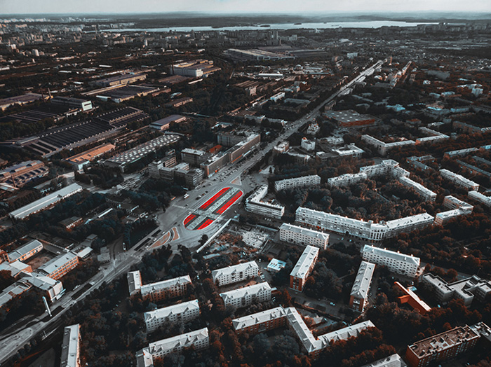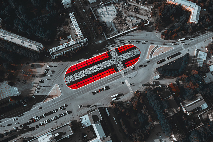 — «Супрематический крест» — роспись по форме площади [Первой Пятилетки]. Я создал ее с отсылкой к истории города и промышленного развития Уралмаша. [Район] весь состоит из знаковой советской промышленный архитектуры, на которую, в свою очередь, оказал влияние русский авангард: Малевич, Татлин, Родченко и другие. (Среди работ Малевича, как и у других авангардистов, часто встречаются изображения крестов — черных и белых — прим. «Бумаги»).