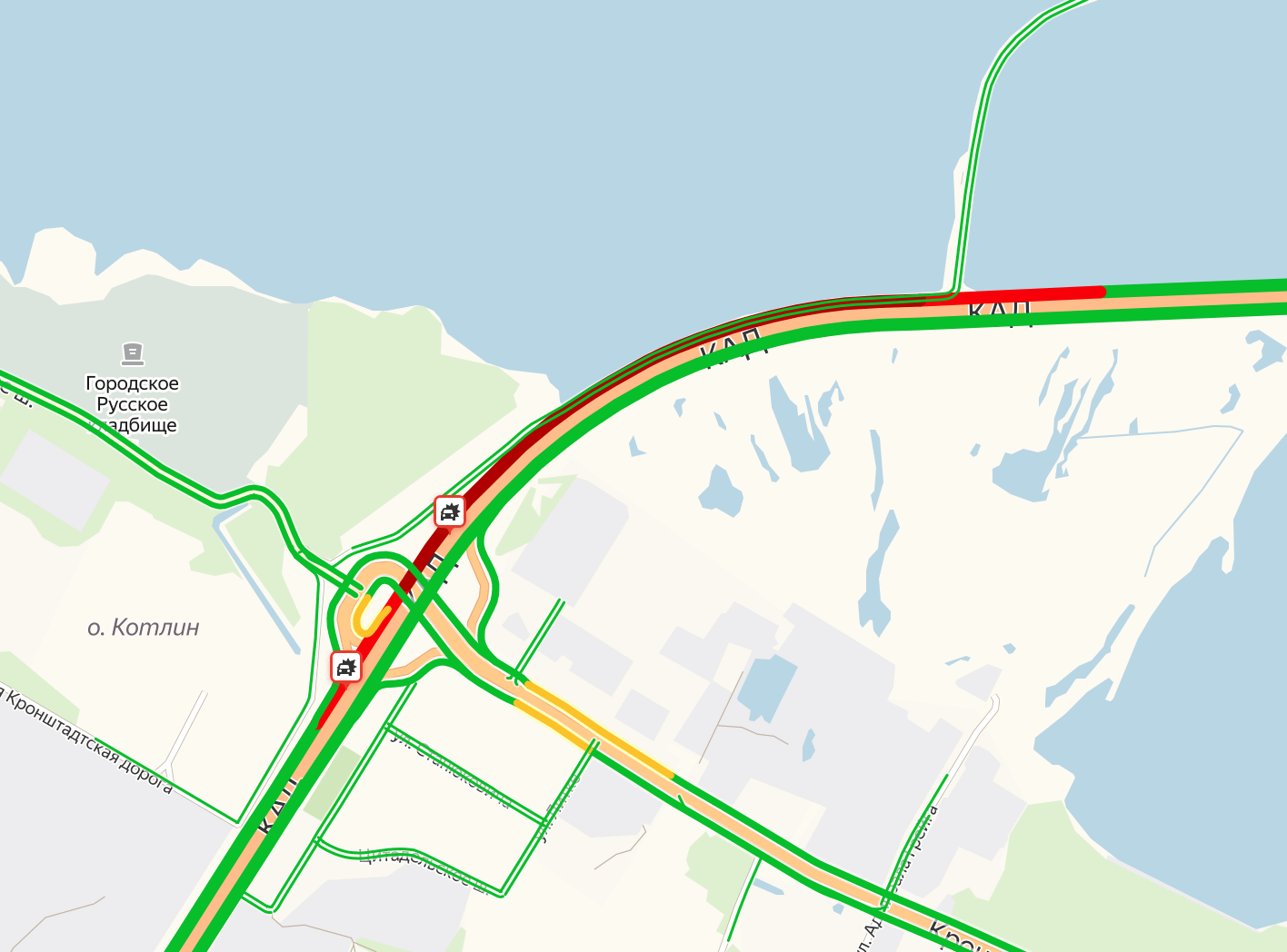 По данным сервиса «Яндекс.Карты», на КАД около Кронштадта образовалась пробка.