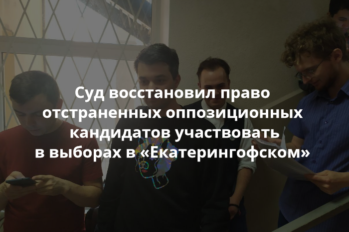 Иск с требованием снять оппозиционных кандидатов подали выдвиженцы от «Единой России». Истцы настаивали, что кандидаты подавали документы после окончания положенного срока. Однако этот срок своим решением официально продлевал Горизбирком из-за многочисленных нарушений в «Екатерингофском».