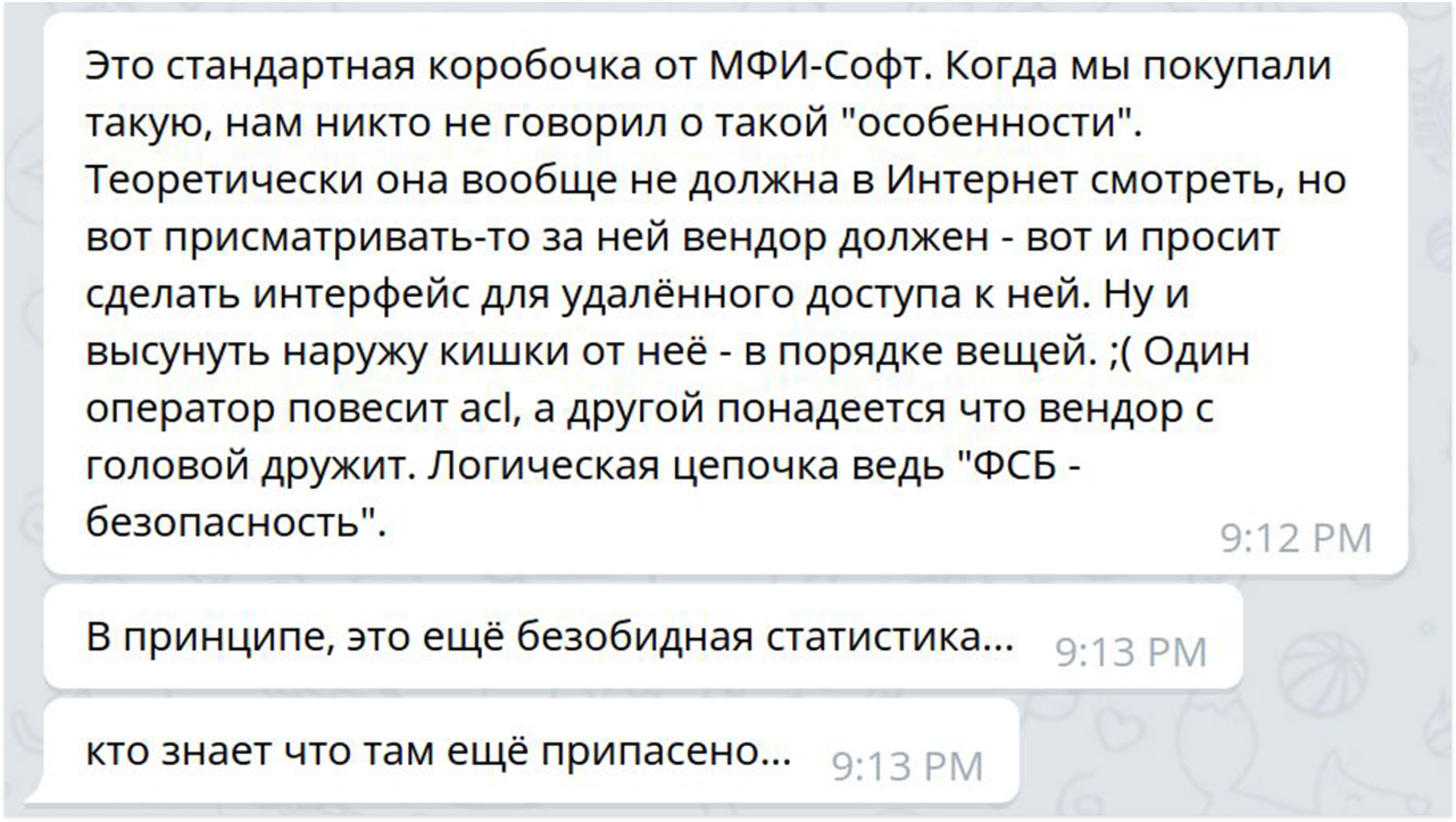 «Как честный человек, я перво-наперво отправил сообщения об этом провайдерам, чтобы разобрались, что это такое. Мне ответили, что это стандартная „коробка“ от разработчика СОРМ и системы „Ревизор“», — продолжил презентацию Евдокимов. Он показал зрителям фрагмент интернет-переписки с неназванным сотрудником одного из провайдеров. Собеседник программиста прямо указал, что речь идет о технике «МФИ Софт» — одного из крупнейших российских поставщиков оборудования СОРМ. Это произошло в мае 2018 года, уточнил Евдокимов «Медузе».