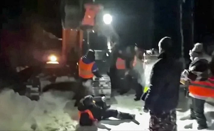 Видео, записанное в ту ночь, давно разошлось по соцсетям. Но смотреть его все еще страшно: экскаватор с ковшом наперевес идет прямо на перекрывших дорогу людей, которые чудом от него уворачиваются, падают в снег. Истошно кричат женщины. Экскаватор прет на людей, которым некуда бежать: за их спинами — вагончик, на обочинах огромные сугробы.
