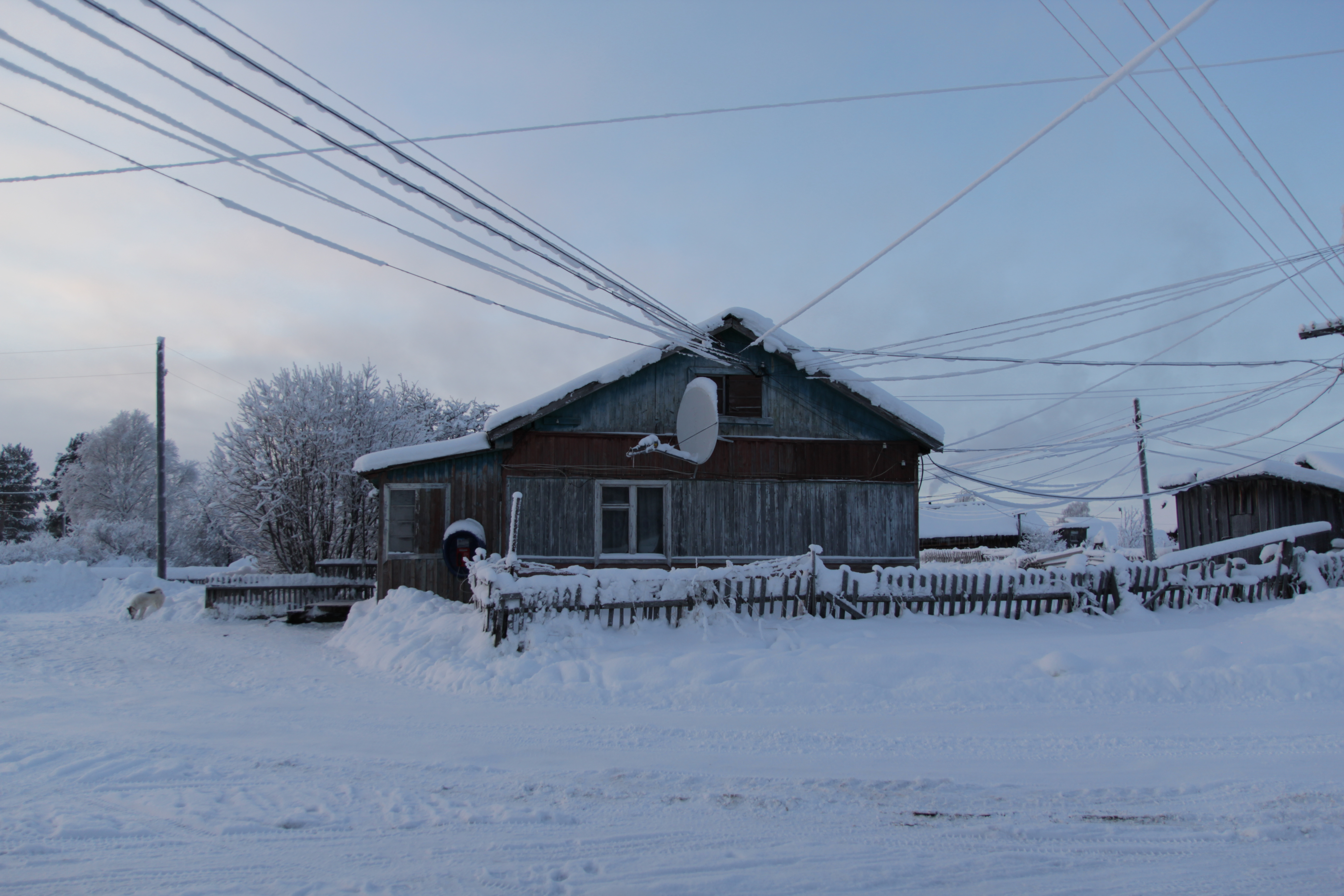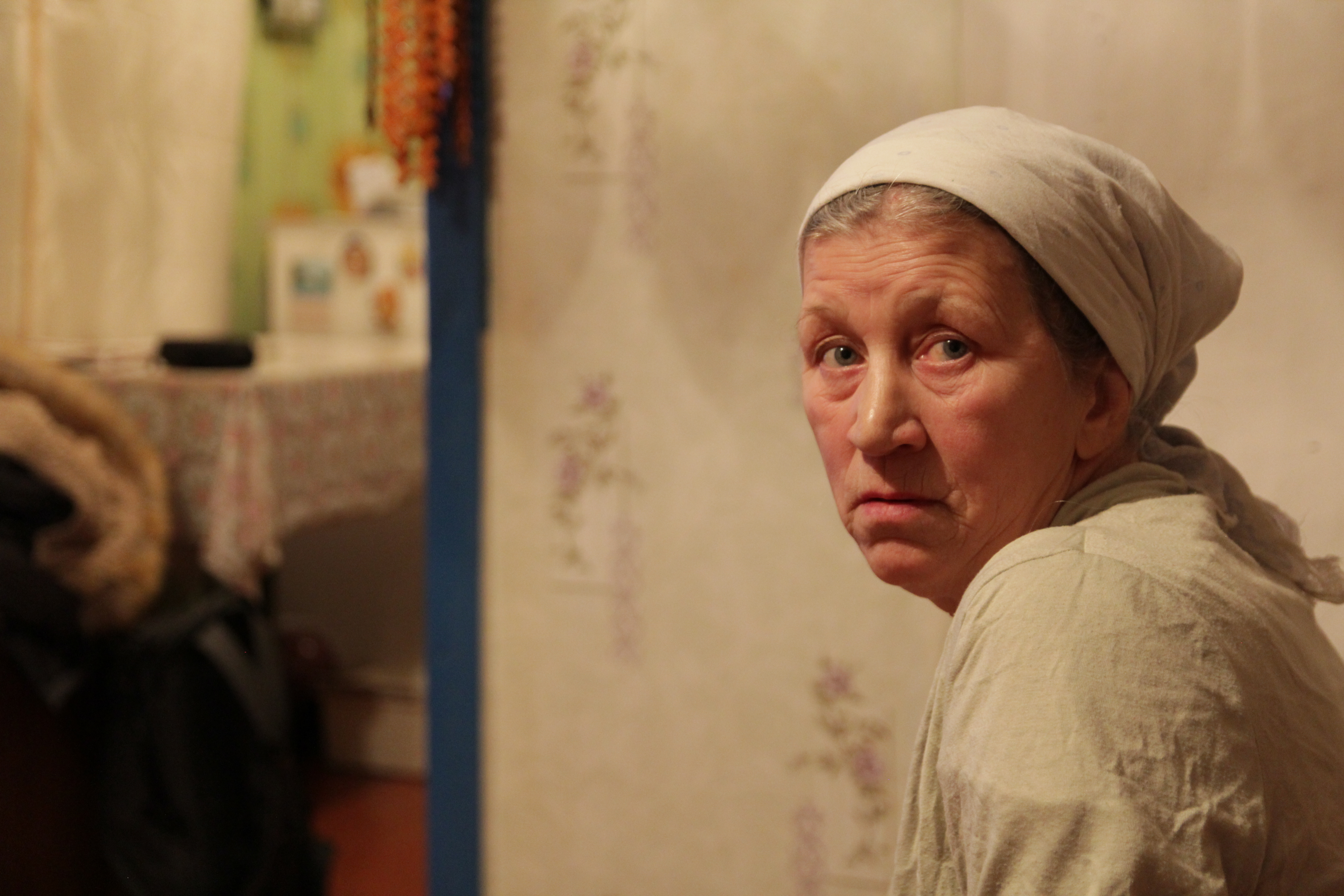 В день нашего приезда в поселке – минус тридцать градусов. Жители Панозера поселили нас в еще непротопленную избу. На лавке стоят ведра с водой, сверху – корка льда. Сидим в одежде. Пока топим печку, местная жительница Раиса Гаврилова греет руки. На ней оранжевый платок, красная стеганая куртка и бурки.