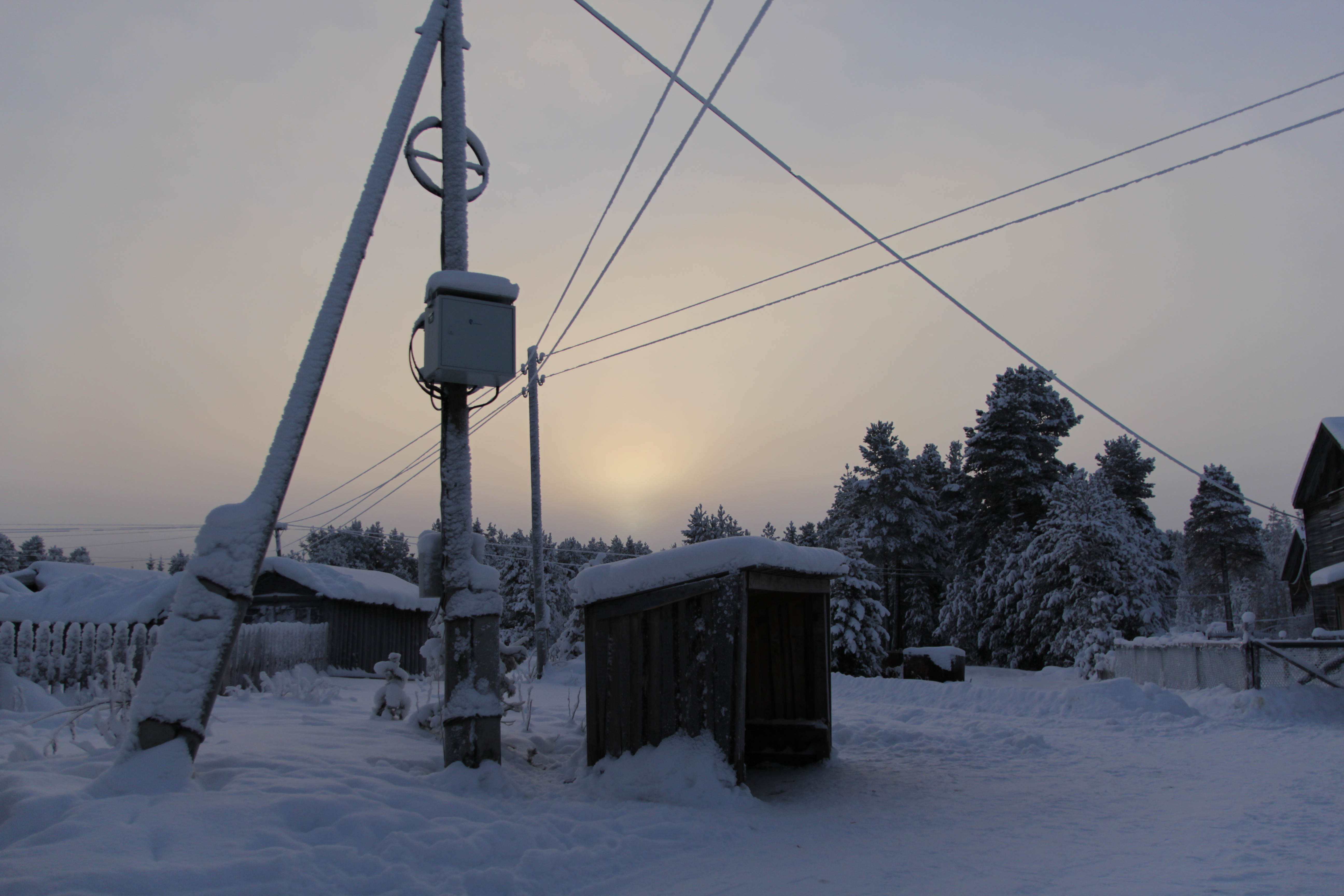 К зданию местной почты сходятся обледеневшие провода. Пейзаж напоминает картины современного художника Васи Ложкина. За прилавком – газеты, журналы, варенья, соленья, консервы, рис, гречка, стиральные порошки. Начальница местной почты Ирина Болтромюк сидит в шапке и куртке. Два обогревателя, которые установили накануне, нагрели помещение до +9 градусов. Она наливает из алюминиевого бидона воду в электрический чайник, включает его. Через минуту свет гаснет – выбило пробки.