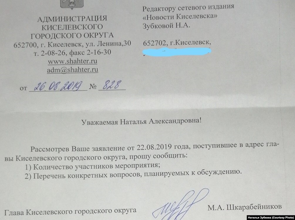 В документе за подписью главы Киселевска Максима Шкарабейникова Наталье Зубковой предлагается назвать "количество участников мероприятия" и "перечень конкретных вопросов, планируемых к обсуждению".