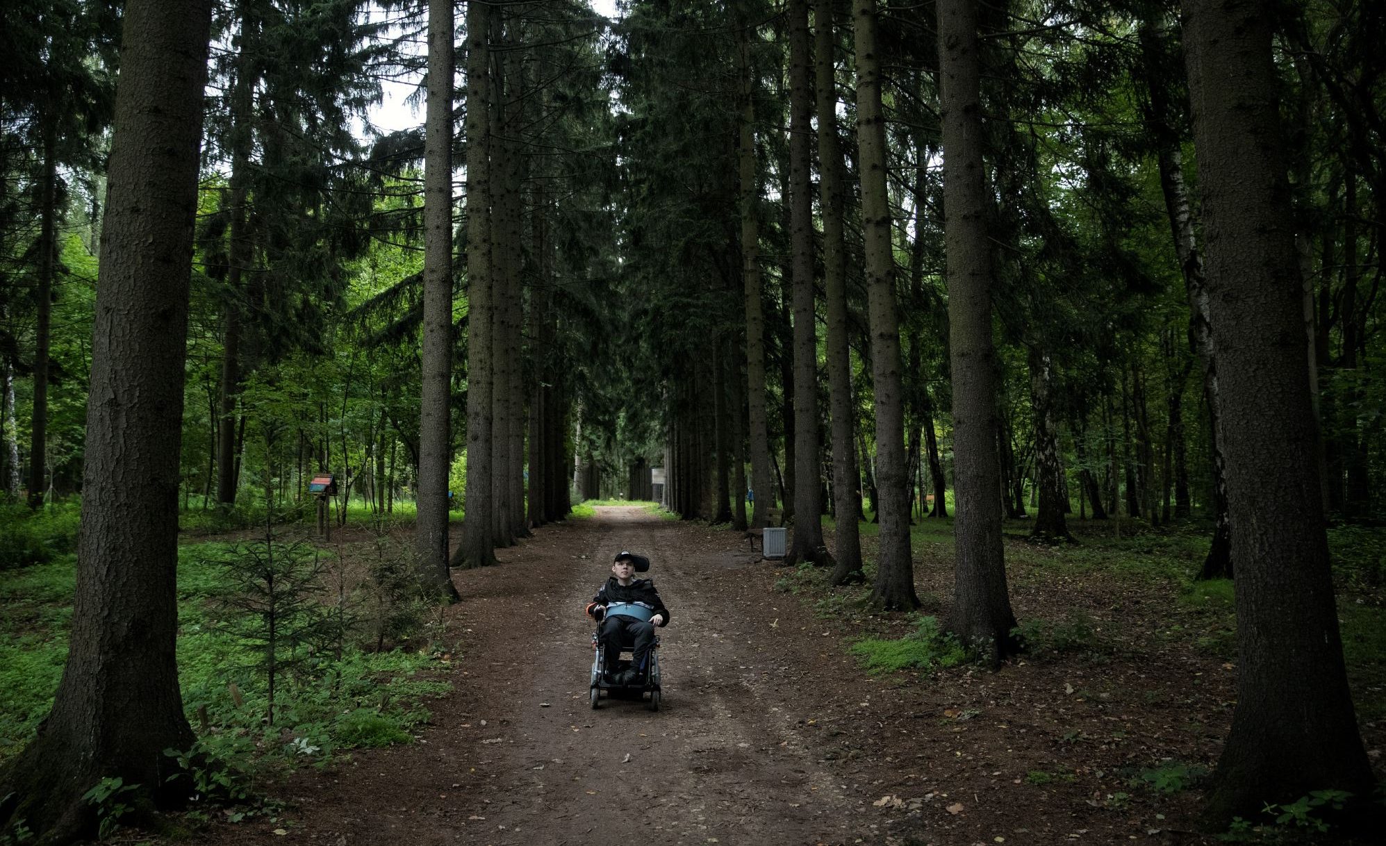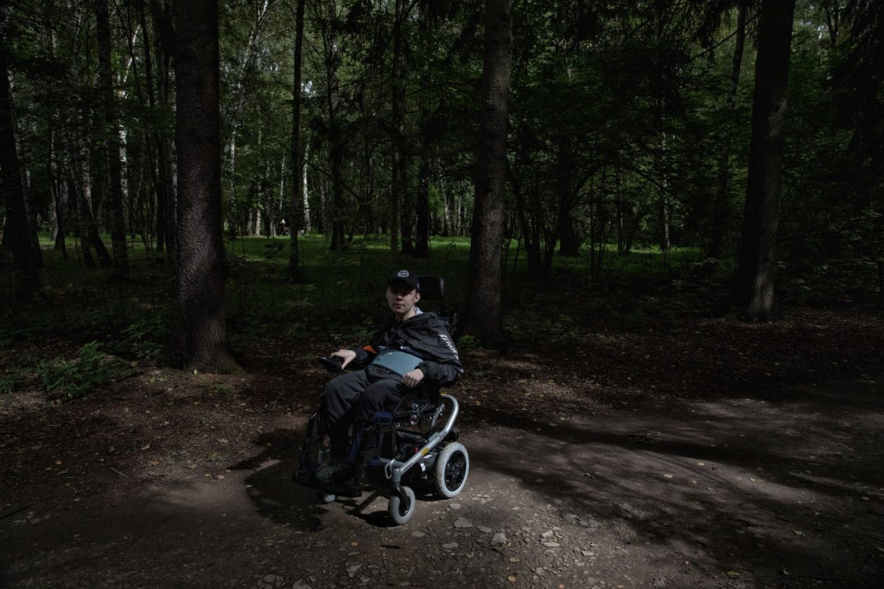 Но после моих уговоров Андрей все-таки соглашается выйти из дома в другой день. Я приезжаю снова, мама сажает Андрея в подъемник, потом в кресло. Подкладывает мягкие подушечки под ноги и руки. Правую руку, которой Андрей будет управлять креслом, приматываем к ручке. Потом лифт, все эти ступеньки и выступы. Дорога до парка, бордюры и светофоры, на которых мы очень долго стоим, потому что Андрей не успевает проехать на зеленый сразу через несколько переходов. У главного входа в парк гравийная дорожка — кресло Андрея по ней не проедет, и приходится объезжать почти весь парк до следующего входа.