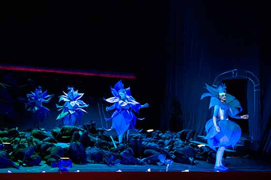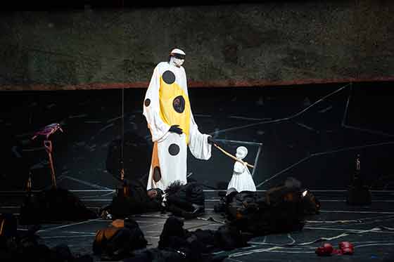 © SF / Monika Rittershaus Переживание чисто музыкальных событий, совершавшихся в оркестре, было столь же интенсивным, как и ощущение сгустившегося хоррора на сцене. С первых же нот оркестровой прелюдии — сумрачного ламентозного хода басов и «тремоло ужаса» — сидящих в зале пробрала дрожь: начало не сулило ничего хорошего. На сцене в кромешной тьме появилось пятнышко света: там кто-то копошился, какое-то существо — то ли кошка, то ли кролик… Но это оказался пятнистый странноватый младенец с вмятинами на несообразно огромном черепе, который освещали два голубых глаза-блюдца. Младенец сучил ножками и извивался, силясь ползти. Справа и слева, передвигаясь по кромке сцены замедленным ритуальным шагом, к нему приближались родители: царь Лай, заключенный в блестящую скорлупу условных «доспехов», увенчанных зубчатой короной на голове куклы-чучела, и робкая незабудка-Иокаста — голубые лепестки карнавального одеяния скрывали фигуру, превращая ее в ходячий цветок.