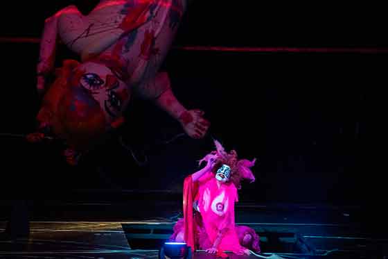 Подчеркнутая условность театра представления необъяснимым образом уживается с атмосферой иррационального, хтонического ужаса, который не отпускает вплоть до финальной сцены смерти Эдипа. Фрайер, который всегда сам оформляет свои спектакли и придумывает костюмы, нагнетает ужас постепенно, по капле, достигая кульминации дважды: в конце второго акта, когда сцену заполоняют монструозные твари, и в конце третьего, когда Эдип, узнав наконец страшную правду, ослепляет себя.