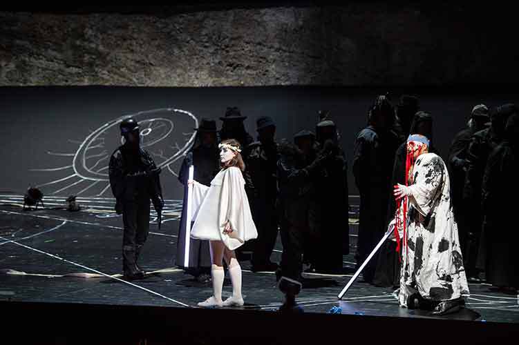 Но «Эдип» в Зальцбурге — это совсем другая история. Здесь он встраивается в череду постановок опер ХХ века, которые начиная с нулевых регулярно появляются на сцене Фельзенрайтшуле. И столь же регулярно в отборе оперных названий участвует Инго Мецмахер. Он же, как правило, и дирижирует отобранными к постановке операми, демонстрируя подчеркнуто уважительное отношение к партитуре и намерениям автора. Мало кто может сравниться с ним в понимании мельчайших подробностей языка и авторского стиля композиторов ХХ века: так фантастически точно и бережно, со вкусом к деталям, с обостренным чувством звукового баланса он интерпретирует важнейшие оперные тексты новейшего времени. Не стал исключением и «Эдип». Бархатная, ясно артикулированная игра Венского филармонического оркестра как бы окутывала светящимся звуковым облаком происходящее на сцене.