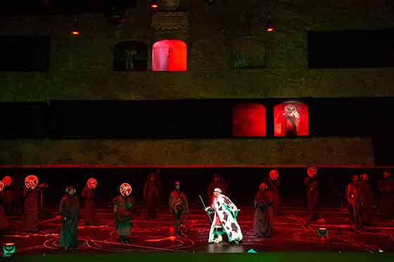 © SF / Monika Rittershaus В театре-мистерии важна каждая мелочь: загадочные руны, нарисованные мелком, будто детской рукою, покрывают настил сцены и дальнюю стену Фельзенрайтшуле. Каждая руна исполнена значения: бицепс, стрела, наложенная на тетиву, огромное глазное яблоко, утыканное чудовищными загнутыми ресницами… вскоре персонаж-глашатай с глазным яблоком вместо головы появится на балконе, где сидят ударники… Полоски ткани змеятся, выползая из-под тела поверженного Эдипа в разные стороны: это символ трех дорог, того самого рокового перекрестка, на котором он повстречался с Лаем. Сергей Аверинцев писал, что перекресток трех дорог — это три линии судьбы Эдипа: одна ведет к инцесту, другая — к власти, понятой как эротическое обладание царицей Иокастой, и третья — к знанию, понятому как нескромное проникновение в сокровенное. Не знаю, читал ли Фрайер Аверинцева, но эти полоски ткани иллюстрируют высказывание Аверинцева буквально.