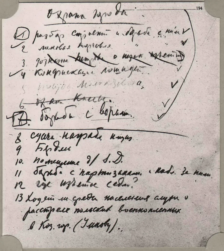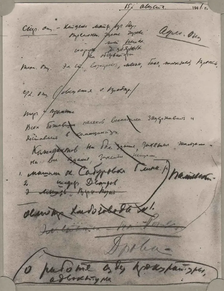 Не покладая рук группа работала больше трех месяцев — с 5 октября 1943-го по 10 января 1944 года — и нарыла на два тома материалов предварительного расследования. Среди найденного и «блокнот Меньшагина» с 17 страницами рабочих записей, относящихся к августу–ноябрю 1941 года7. О чем замнаркома Богдан Кобулов незамедлительно, 16 октября, сообщил в А.С. Щербакову — заведующему отделом международной информации ЦК ВКП(б) и одновременно начальнику ГЛАВПУРа8.