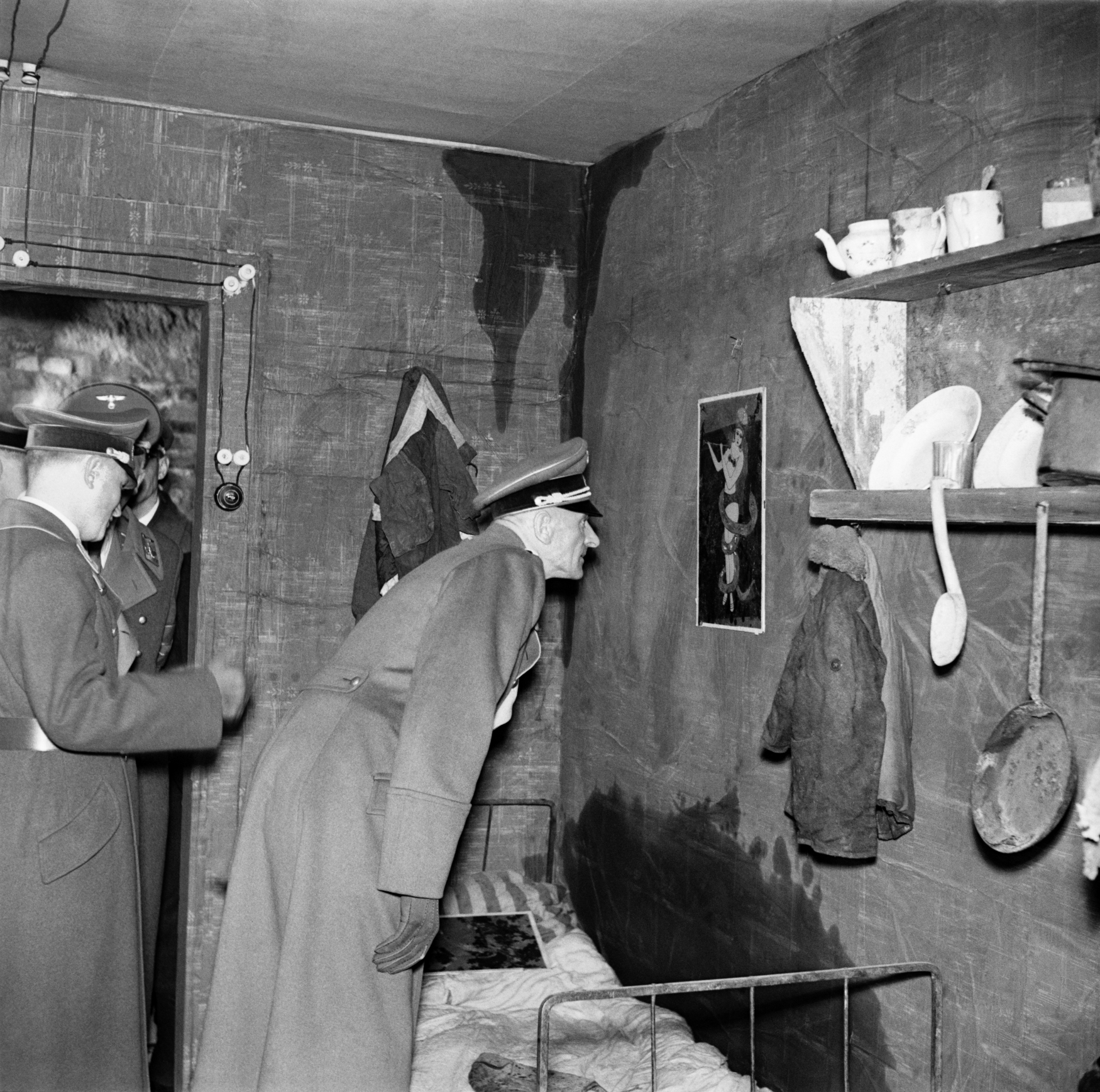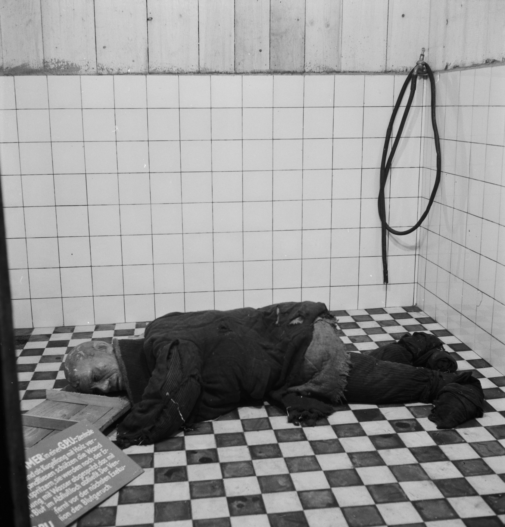 Член гитлерюгенда перед муляжом камеры НКВД на выставке в Берлине в мае 1942 года