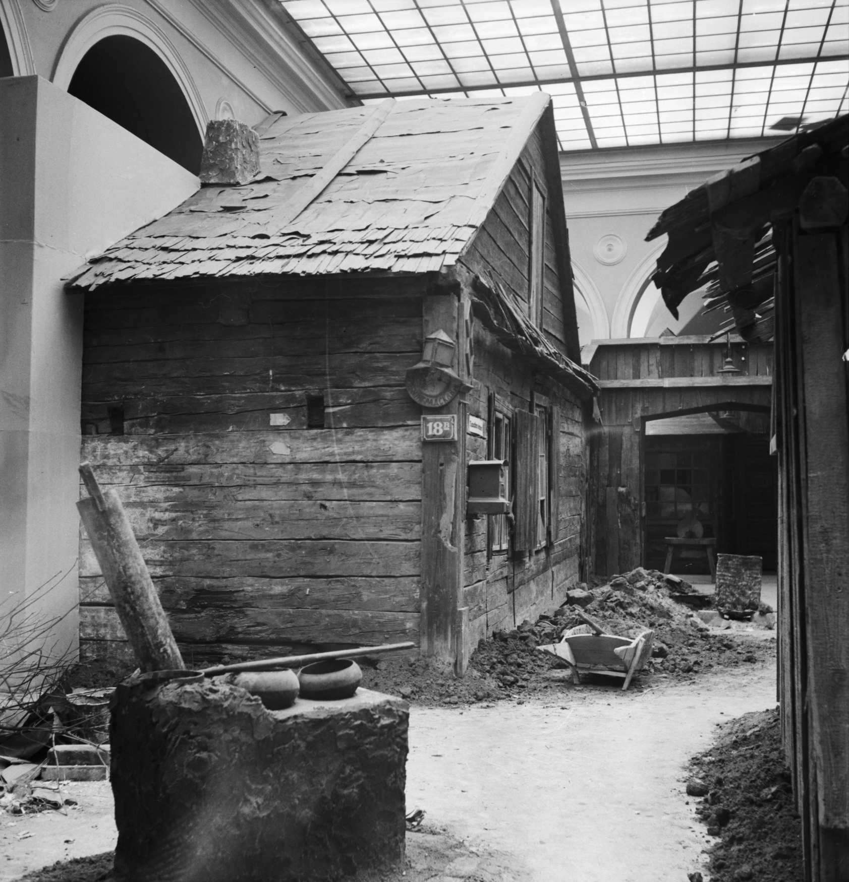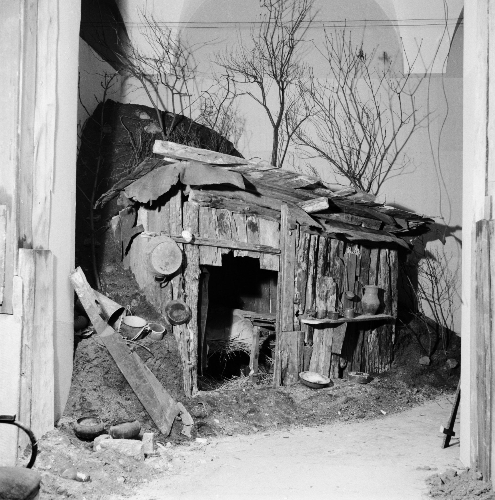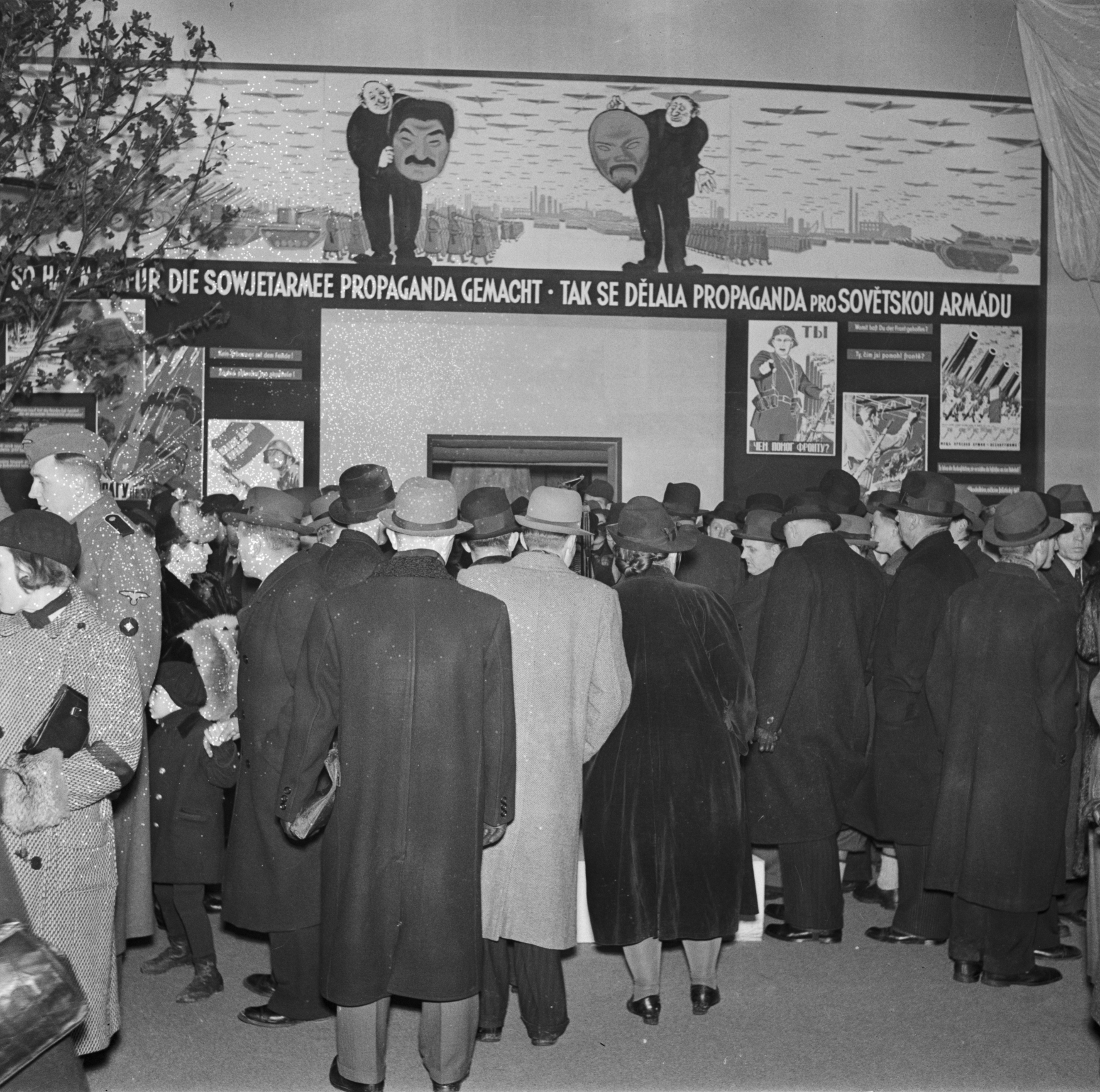 Один из экспонатов выставки, которая была открыта с 9 утра до 9 вечера в течение всего марта 1942 года, представлял собой целый ряд деревенских домов, которые перевезли с захваченной советской территории и восстановили, чтобы показать "серую нищету" жизни при большевиках.