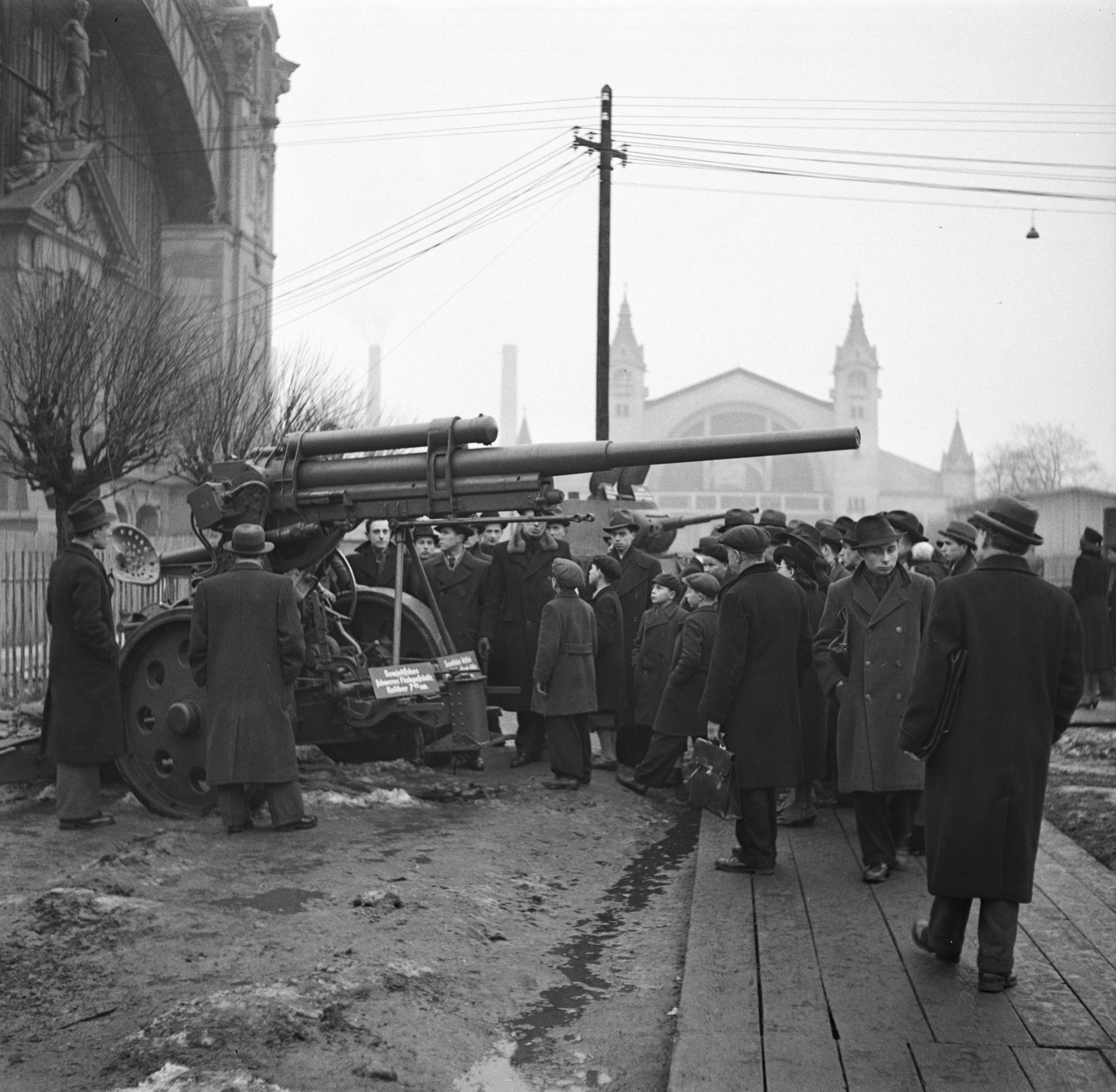 Посетители выставки столпились у захваченной советской артиллерийской установки