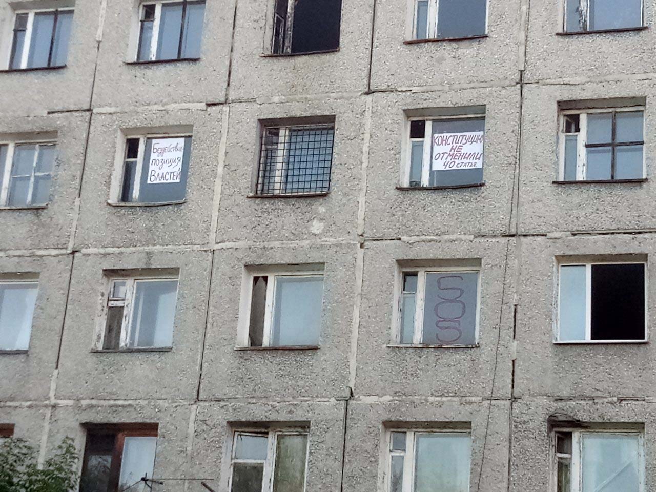 Кроме надписей краской на окна наклеены и бумажные плакаты с лозунгами: "Тут находиться опасно!", "Мы не хотим остаться жить на улице", "Бездействие – позиция властей", "Конституцию не отменили. 40 статья", "Хватит обещать – пора исполнять".