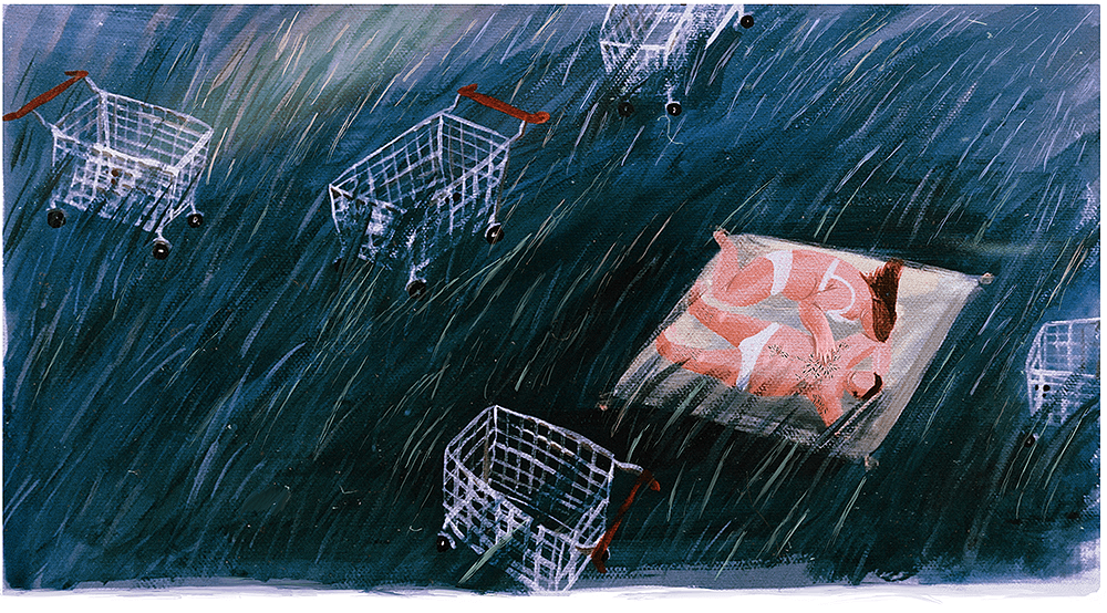 «Магазин закрывается через полчаса», — слышится голос из репродуктора под потолком «Ашана». Гриша срывается.