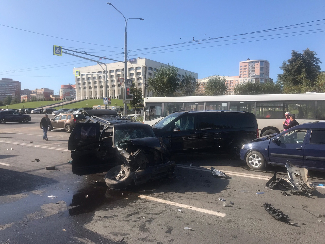 28 августа около 15:00 в районе администрации Владимирской области водитель внедорожника “Ford” проезжал на запрещенный сигнал светофора. В это время со стороны Октябрьского проспекта уже начал свое движение автомобиль “Hyundai” (“Яндекс. Такси”). От сильного удара внедорожник отбросило на встречную полосу, где на красном сигнале светофора стоял поток машин. От столкновения в этой полосе пострадали “Mercedes”, “Nissan” и “Лада”, а стоящий на повороте “Lexus” задело обломками корпусов машин.