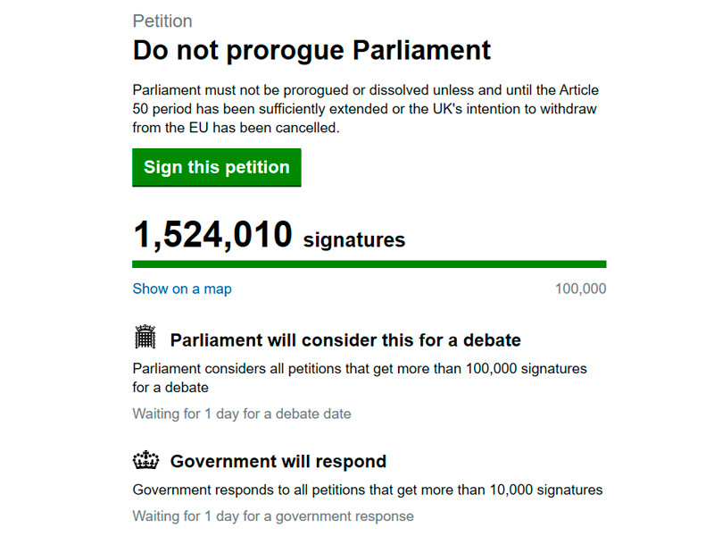 Петиция была размещена на сайте Вестминстера 6 августа, и ей понадобилось более 22 дней, или 531 час, чтобы преодолеть отметку в 10 тыс. подписей. Все изменилось после того, как премьер-министр Борис Джонсон в среду объявил о том, что получил санкцию королевы Елизаветы II на то, чтобы приостановить работу парламента до 14 октября, передает ТАСС. Всего за один час после этого коллективное обращение подписали 100 тыс. человек, к полуночи число подписавшихся составило 1 млн, а ко второй половине следующего дня - 1,5 млн.