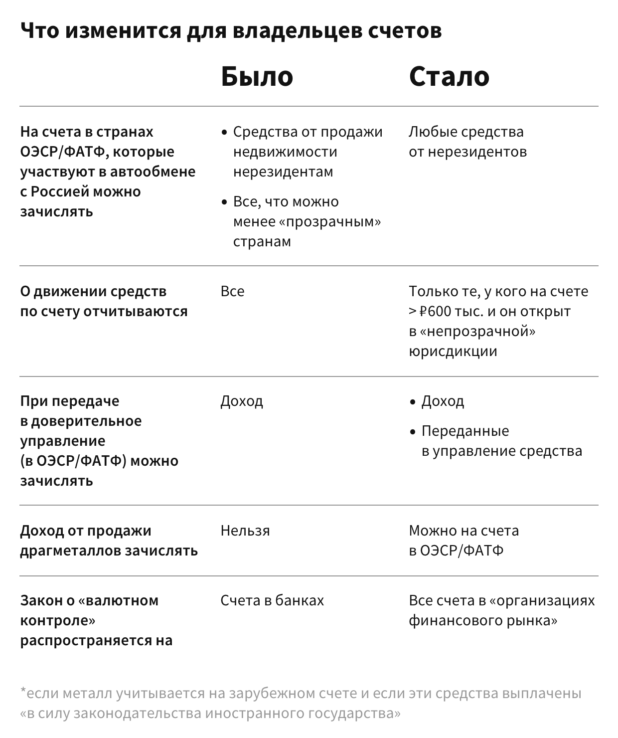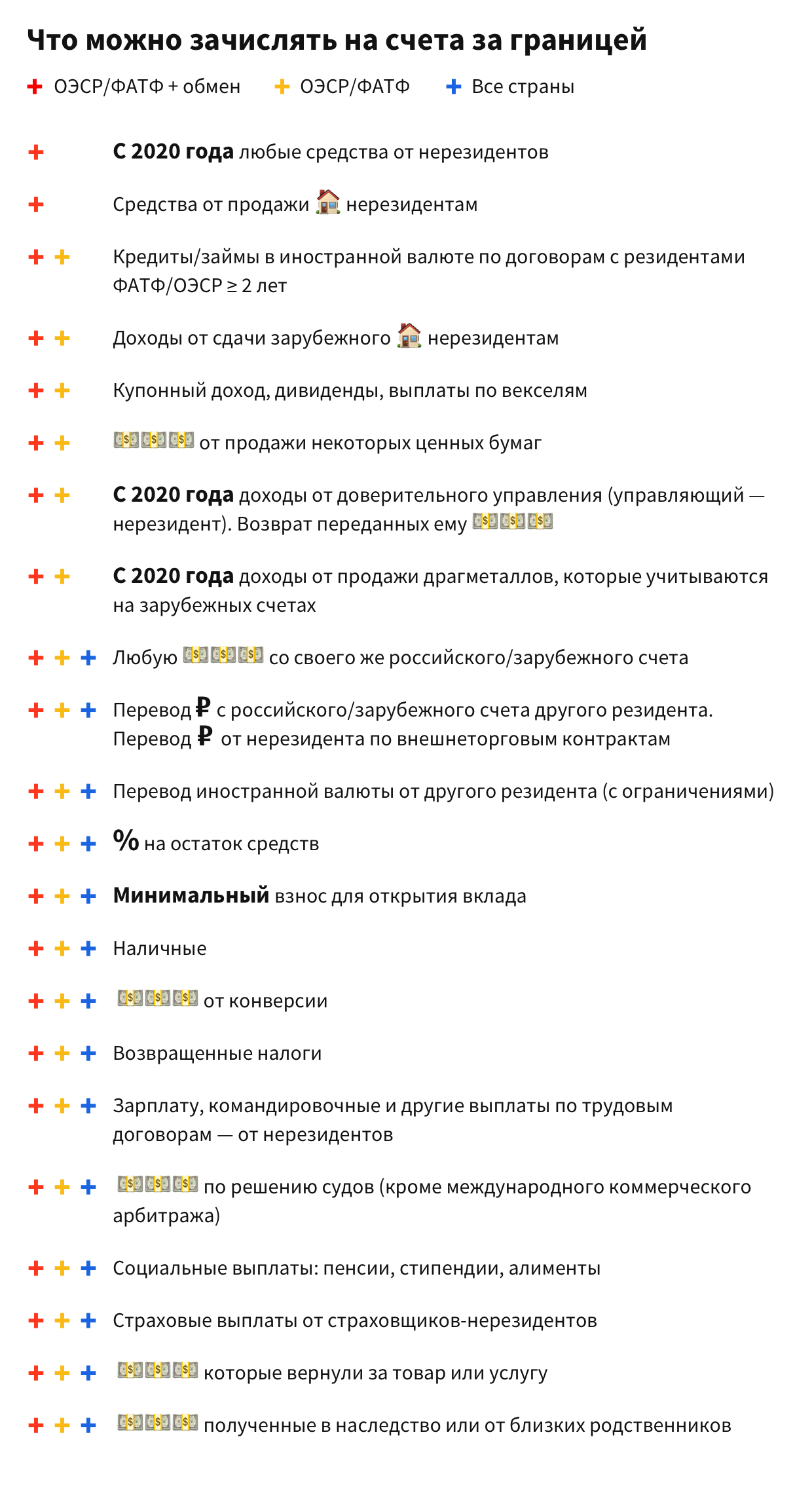 ? В чем подвох: С 2020 года закон будет регулировать не только банковские счета, но и брокерские (или те самые «счета в организациях финансового рынка», о которых мы уже писали выше). На них можно зачислять средства в случаях, которые установит ЦБ. Что это за случаи, не известно. «Пока в публичном доступе перечня этих случаев нет, и будет ли он готов к январю 2020-го, не очевидно», — говорит Грицепанова из PwC Legal. При этом практика склоняется к тому, что пока нет списка, нет и разрешенных операций, предупреждает она. ЦБ работает над тем, чтобы определить эти случаи с учетом того, что изменения вступают в силу 1 января 2020 года, заявили The Bell в пресс-службе регулятора.