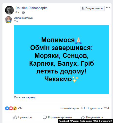 В Фейсбуке исчез пост помощницы народного депутата прошлого созыва Анны Исламовой, в котором она заявила о «завершении обмена» и возвращении в Украину украинских моряков и политузников. Как сообщалось ранее, это сообщение на свою страницу в Фейсбуке репостнул новый генеральный прокурор Руслан Рябошапка.