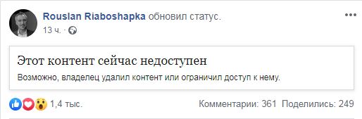 На странице Исламовой в Фейсбуке последним постом отображается другое сообщение с Рады о голосовании за снятие неприкосновенности с депутатов Верховной Рады. У самого Рябошапки репост сохранился, однако в теле поста теперь отображается надпись «Этот материал недоступен».
